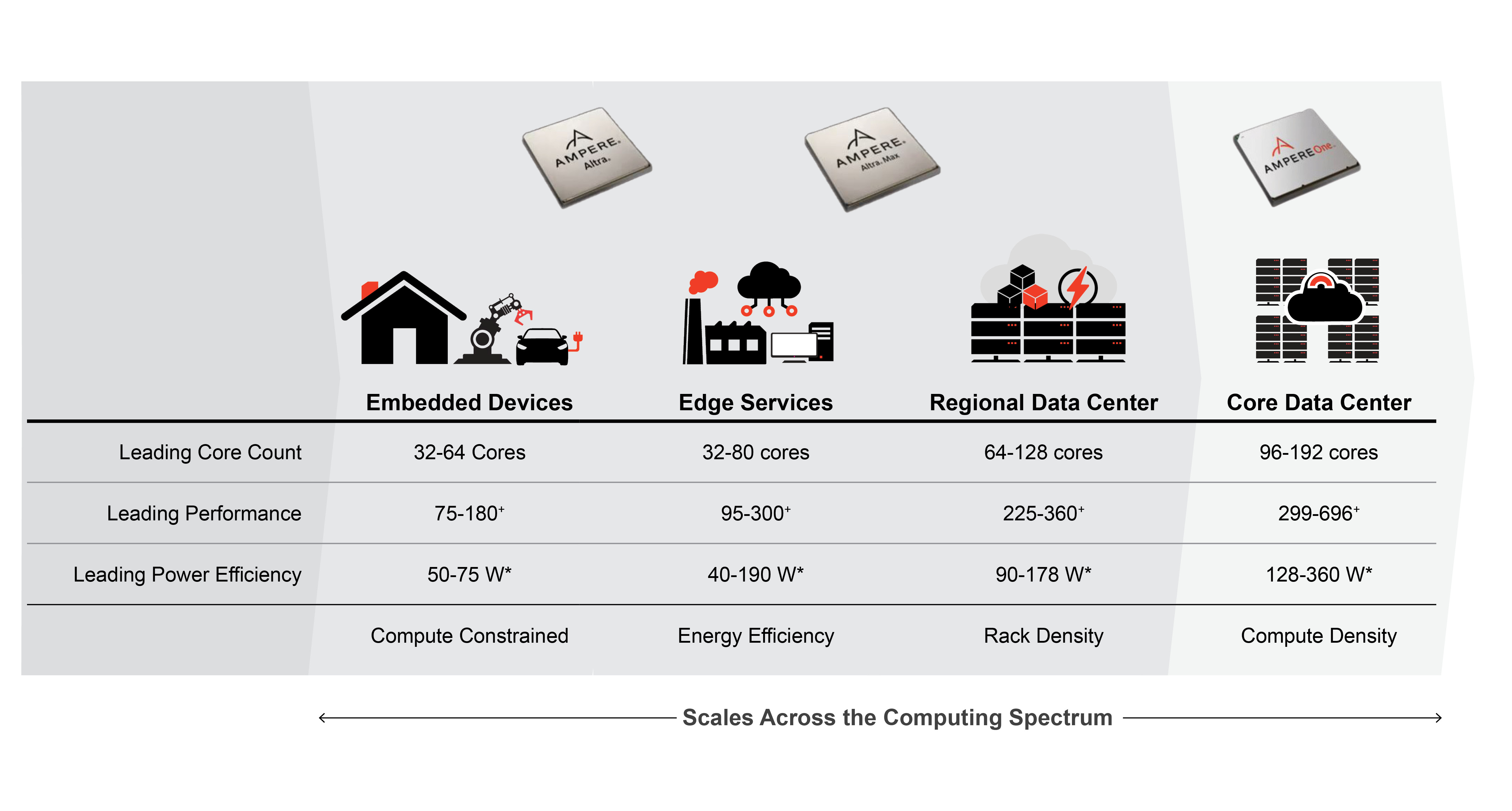The Ampere Altra Family and AmpereOne Family Processors are purpose-built for cloud-native workloads, offering extreme scalability, and energy efficiency. The Ampere Altra Family features up to 128 cores per processor, providing consistent high performance with predictable throughput for demanding multi-threaded applications. The AmpereOne Family offers up to 192 cores, delivering even greater flexibility and power efficiency for AI inference, machine learning, and data-intensive tasks.